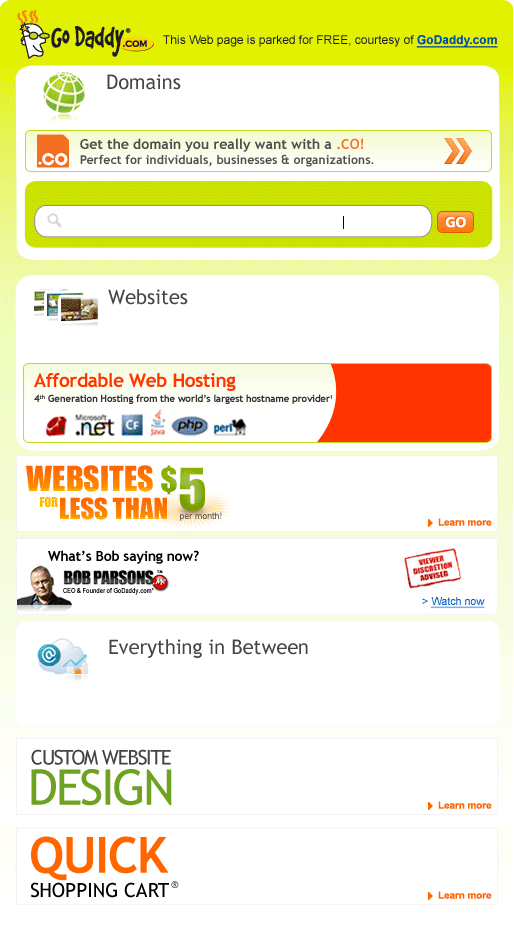 GoDaddy.com GoDaddy.com Domains Get the domain you really want with a .CO! Go Websites Affordable web hosting WebSite Tonight® www.bobparsons.me Everything in between Dream Big! Quick Shopping Cart®